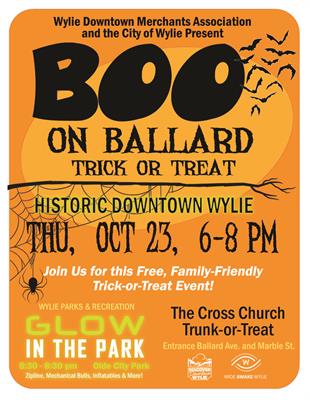 Boo on Ballard is presented by the Wylie Downtown Merchants Association, The Cross Church, and the City of Wylie.