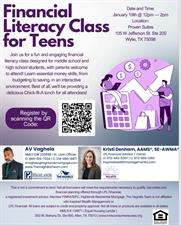 A Financial Literacy Class for Teens will be held on Monday, January 19, from 12:00–2:00 PM at Proven Suites in downtown Wylie.