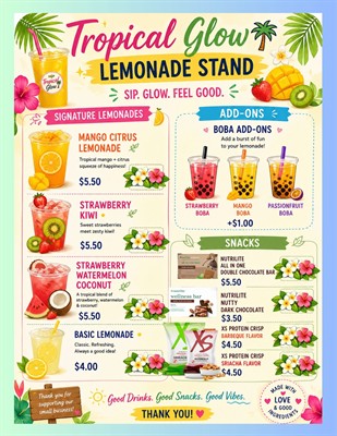 Stop by Tropical Glow Lemonade Stand and enjoy our signature Mango Citrus Lemonade — a refreshing tropical blend of sweet mango, zesty citrus, and sunshine in every sip! ????